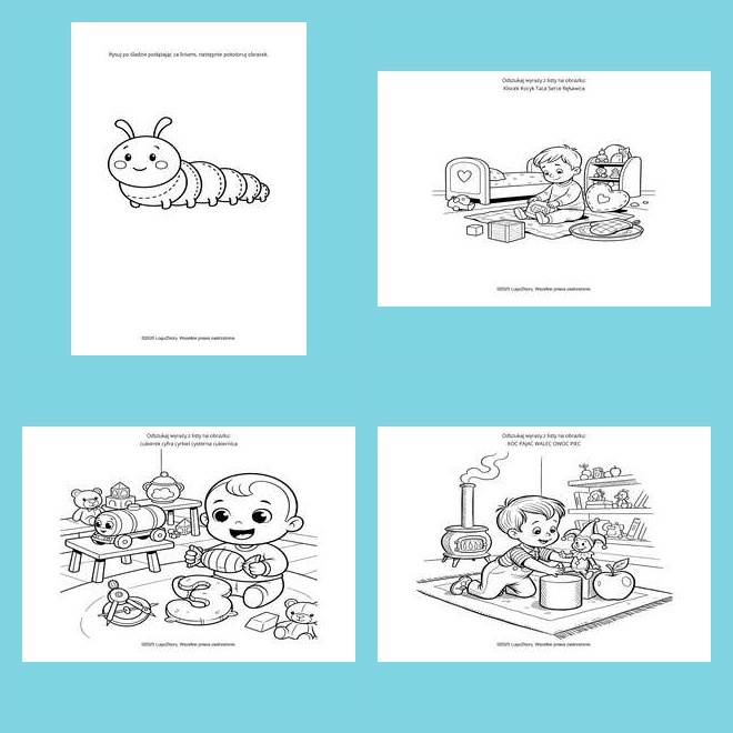 zestaw w wersji czarno-białej – ekonomicznej w druku i angażującej dziecko poprzez kolorowanie,