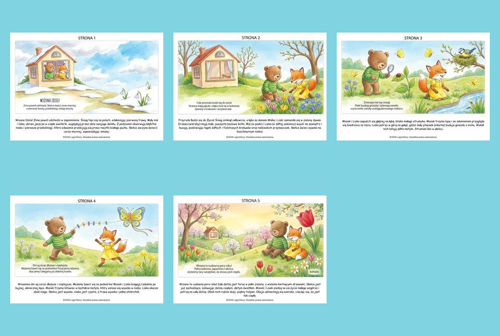 „Historyjka obrazkowa – Wiosna” to przepięknie ilustrowana, prosta opowieść w formie krótkiej książeczki, która wprowadza dzieci w radosny świat wiosennych zmian w przyrodzie. Materiał doskonale sprawdzi się podczas zajęć logopedycznych, w przedszkolu, szkole oraz w domu – jako inspiracja do rozmów, opowiadania i rozwijania słownictwa.
