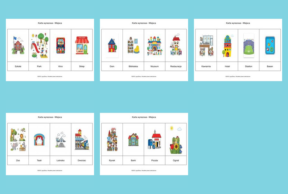 Pakiet kart wyrazowych o tematyce Miejsca to praktyczne narzędzie wspierające terapię logopedyczną, zajęcia w przedszkolu oraz naukę w domu.
